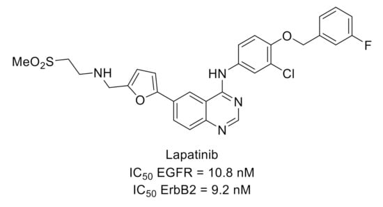 Lapatinib structure and kinase inhibitory potency toward EGFR and ErbB2.