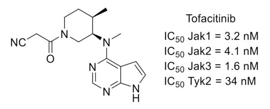 Tofacitinib structure and kinase inhibitory potency toward Jak and Tyk.