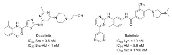 - Lombardo, L.J.; Lee, F.Y.; Chen, P.; Norris, D.; Barrish, J.C.; Behnia, K.; Castaneda, S.; Cornelius, L.A.M.; Das, J.; Doweyko, A.M.; et al. Discovery of N-(2-chloro-6-methylphenyl)-2-(6-(4-(2-hydroxyethyl)-piperazin-1-yl)-2-methylpyrimidin-4-ylamino)thiazole-5-carboxamide (BMS-354825), a dual Src/Abl kinase inhibitor with potent antitumor activity in preclinical assays. J. Med. Chem. 2004, 47, 6658–6661. [Google Scholar] [CrossRef]
