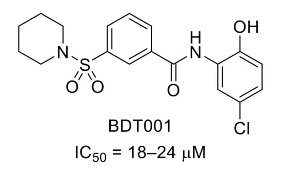 FLT3 tyrosine kinase is expressed in most hematopoietic cells. Recently, it was demonstrated that in dorsal root ganglia, FLT3 is a critical actor in peripheral neuropathic pain initiation and maintenance in mice. Using X-ray crystal structure of FLT3 bound to cytokine FMS-like tyrosine kinase 3 ligand (FL) (PDB ID: 3QS7), as well as in silico screening, hits were identified that effectively prevented extracellular FL binding to FLT3 []. This work led to the synthesis and further biological evaluation of BDT001, a noncompetitive FL-binding inhibitor that disrupted the positive cooperativity of FL binding (Figure 11). BDT001 inhibited FL-induced FLT3 phosphorylation in leukemia-derived RS4-11 cells with an IC50 of 18–24 µM. It was suggested that BDT001 is an FLT3 negative allosteric modulator. Intraperitoneal administration of BDT001 in mice suppressed FL-induced mechanical hypersensitivity and inhibited mechanical hypersensitivity in the sciatic nerve chronic constriction injury (CCI) model. However, BDT001 did not change CFA-induced inflammatory mechanical pain hypersensitivity.