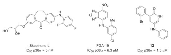 Finally, compound 12 is a pyridinone derivative recently reported as a selective p38α MAPK inhibitor, with an IC50 value of 1.5 µM (Figure 12) []. Its selectivity was demonstrated using a panel of 62 protein kinases including p38 isoforms and protein kinases close to p38 in the phylogenetic tree. Compound 12 was evaluated in vivo for its antalgic properties. It was found to prevent mechanical allodynia in a rat model of CFA-induced inflammatory pain and quickly reverse facial neuropathic mechanical allodynia.