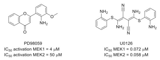 Structures and kinase inhibitory potencies toward MEK1/2 of PD98059 and U0126.