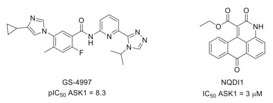 Structures and ASK1 inhibitory potencies of GS-4997 and NQDI1.