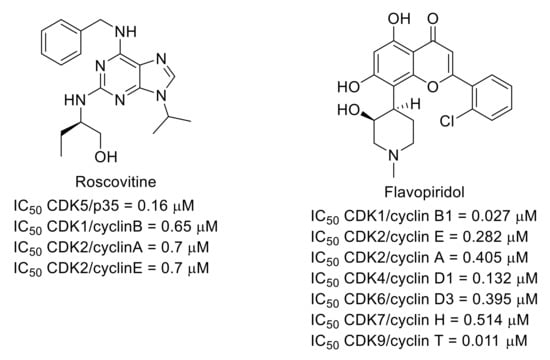 Structures of roscovitine and flavopiridol and inhibitory potencies toward CDKs.