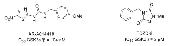 Glycogen synthase kinase 3 (GSK3) is a serine/threonine kinase that occurs in two isozymes in mammals: GSK3α and GSK3β. In particular, GSK3β plays a role in neuroinflammation and pain [,]. AR-A014418 is an ATP-competitive inhibitor of GSK3 with an IC50 value of 104 nM (Figure 18). This compound produced an analgesic effect in several mouse models of nociception [,]. It was also shown that GSK3 inhibitor TDZD-8 (Figure 18) attenuated remifentanil-induced mechanical and thermal hyperalgesia in rats [].