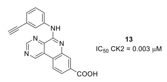 Serine/threonine kinase CK2 has been widely targeted for cancer applications. However, it was reported that CK2 can be involved in the modulation of pain []. A rationally designed SAR study starting from a selective ATP-competitive CK2 inhibitor developed for cancer application led to the discovery of compound 13, an orally available nanomolar CK2 inhibitor that reduced formalin-induced pain in mice (Figure 19) [].