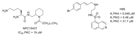- Sullivan, J.P.; Connor, J.R.; Shearer, B.G.; Burch, R.M. 2,6-diamino-N-([1-(1-oxotridecyl)-2-piperidinyl]methyl)hexanamide (NPC 15437): A selective inhibitor of protein kinase C. Agents Actions 1991, 34, 142–144. [Google Scholar] [CrossRef] [PubMed]