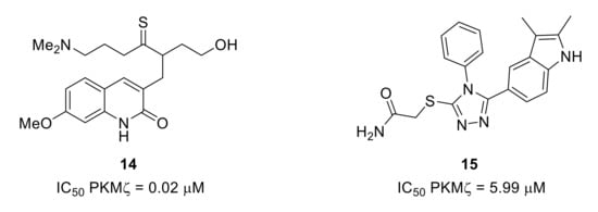 The design of ATP-competitive PKMζ inhibitors based on a model built by sequence homology from PKCι led to quinolinone 14 and triazole 15 (Figure 21). Due to cytotoxicity problems, quinolinone 14, the most potent PKMζ inhibitor of the series, was not used in cellular assays. However, the triazole derivative with lower PKMζ inhibitory potency led to reduced expression of proinflammatory mediators in cells [].