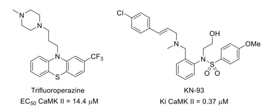 - Sumi, M.; Kiuchi, K.; Ishikawa, T.; Ishii, A.; Hagiwara, M.; Nagatsu, T.; Hidaka, H. The newly synthesized selective Ca2+/calmodulin dependent protein kinase II inhibitor KN-93 reduces dopamine contents in PC12h cells. Biochem. Biophys. Res. Commun. 1991, 181, 968–975. [Google Scholar] [CrossRef]