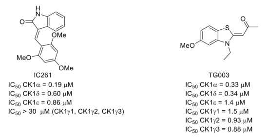- Mashhoon, N.; DeMaggio, A.J.; Tereshko, V.; Bergmeier, S.C.; Egli, M.; Hoekstra, M.F.; Kuret, J. Crystal structure of a conformation-selective casein kinase-1 inhibitor. J. Biol. Chem. 2000, 275, 20052–20060. [Google Scholar] [CrossRef]