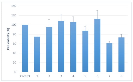 Cell viability (%) upon treatment with chalcone (1–8) in concentration of 50 ppm.