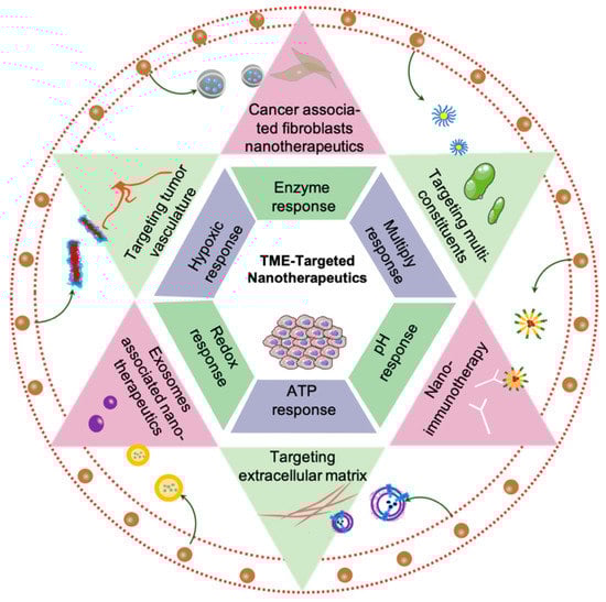 Owing to the complex and continuously evolving tumor microenvironment (TME), cancer becomes one of the most difficult diseases to cure all over the world. The bidrectional interactions between tumor and the TME bring about the progression, therapeutic resistance, and metastasis of cancer [1]. TME composes various supporting cells such as immune cells, fibroblasts, endothelial cells, and extra components like exosomes, cytokines, enzymes, growth factors, and extracellular matrix (ECM), etc. [2,3]. In addition, the tumor microenvironment displays unique pH values, hypoxic condition, high ATP concentration, and abundant tumor microvasculature [4,5,6]. The communications between tumor cells and the microenvironment result in drug resistance by changing the phenotypes of tumor cells as well [7]. Therefore, treatment targeting the microenvironment has attracted increasing attention.