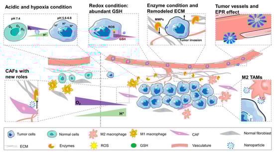 The role of the TME during nano-targeted tumor treatment strategies has been reviewed somewhere, however, most research just focused on part of the compositions or stimuli categories [17,18,19]. This review aims to elaborate the components and physiological conditions of TME, summarize the nano-architectures response to physiological barriers or unique constituents, and discuss the prospect of nano therapeutics in TME (Figure 1).