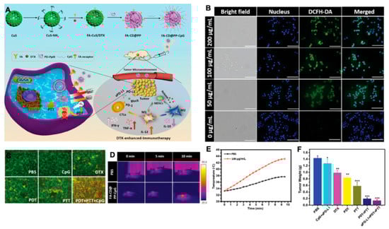 (A) Rational design and synthesis, its application in cancer treatment (left), and illustration of FA-CD@PP-CpG for docetaxel-enhanced immunotherapy (right); (B) intracellular ROS detection in 4T1 cells incubated with various concentrations of FA-CD@PP-CpG under 650 nm irradiation; (C) corresponding fluorescence images of 4T1 cells constrained with calcein AM (live cells, green) and propidium iodide (dead cells, red) after being treated with different conditions. (D) The in vivo thermal images of the mice after intravenous injection of PBS and FA-CD@PP-CpG under 808 nm irradiation; (E) temperature change curve of tumor sites as a function of irradiation time; (F) the weight of tumor tissue in different groups obtained on day 14, adapted with permission from [92].