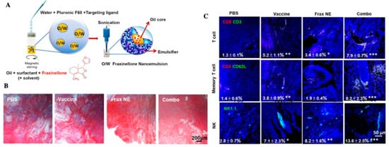 (A) Scheme depicting the preparation process of Frax NE; (B) Masson’s trichrome stain for collagen; (C) confocal and flow cytometric analysis of immune cells infiltration in the TME, adapted with permission from [109].