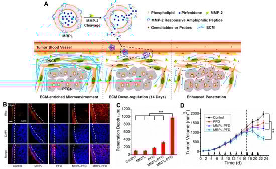 (A) Mechanism of MMP-2 Responsive Peptide Hybrid Liposome (MRPL) for downregulation of ECM in pancreatic tumors; (B) Rhd penetration and distribution in pancreatic tumor (PSCs/Mia-paca-2 co-implanted) tissues after 2 weeks’ treatment of the different PFD formulations; (C) quantification of the depth of Rhd penetration in tumors treated by the PFD formulations; (D) the growth curves of PSCs and Mia-paca-2 co-implanted pancreatic tumors in mice treated by the different PFD formulations, adapted with permission from [112].
