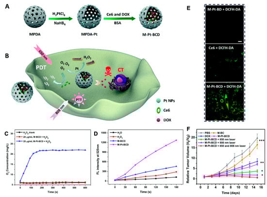 (A) Schematic illustration of the synthesis of MPDA-Pt-BSA/ Ce6/DOX (M-Pt-BCD); (B) schematic illustration of the application of M-Pt-BCD for enhanced- PDT and synergistic therapy; (C) O2 generation of H2O2 blank, M-BCD and M-Pt-BCD; (D) 1O2 production efficiency of H2O, H2O2, M-BCD and M-Pt-BCD; (E) confocal microscopic images of cellular 1O2 levels detected by DCFH-DA staining upon 650 nm irradiation; (F) tumor growth curves, reproduced by permission of The Royal Society of Chemistry [140].
