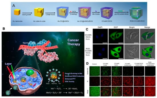 (A) Schematic illustration of the synthesis process for the versatile RGD-CCmMC/DOX nanovehicles; (B) schematic illustration of the therapeutic mechanism of the RGD-CCmMC/DOX nanoplatforms to enhance the overall anticancer efficiency of triple-combination photodynamic/photothermal/chemo-therapy in a solid tumor; (C) CLSM images of 4T1 cells treated with different formulations under laser irradiation. The production of intracellular ROS and O2 generation were measured by the green fluorescence intensity of DCF; (D) fluorescence microscopy images of 4T1 cells with various treatments using Calcein AM/PI staining, adapted with permission from [175].