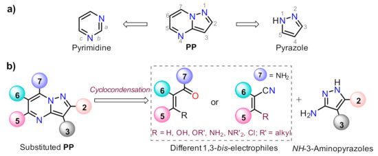 As stated before, the synthesis of PP derivatives is the focus of various research; however, more recent studies in this area are focused on improving known reaction protocols. Regardless, innovative synthesis methods still emerge that offer creative ways to modify established ones. Notably, the main synthesis route of pyrazolo[1,5-a]pyrimidines allows versatile structural modifications at positions 2, 3, 5, 6, and 7 via the cyclocondensation reaction of 1,3-biselectrophilic compounds with NH-3-aminopyrazoles as 1,3-bisnucleophilic systems (Figure 1b) [1,2,3,4,5,6,24,25].
