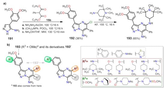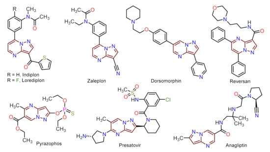 Despite those reports, the synthetic transformations involving this motif still represent a research priority regarding the process efficiency, environmental impact, and the study of its multiple applications. These reports should address protocols that aim to minimize synthesis pathways, employ cheap reagents and develop processes that prevent or reduce waste production. Usually, PP derivative synthesis involves the pyrimidine ring construction via the interaction of NH-3-aminopyrazoles with different 1,3-biselectrophilic compounds such as β-dicarbonyls, β-enaminones, β-haloenones, β-ketonitriles, and so on (Figure 1b) [1,2,3,4,5,6]. Pyrazolo[1,5-a]pyrimidine scaffold is part of bioactive compounds with exceptional properties like selective protein inhibitor [7], anticancer [8], psychopharmacological [9], among others [10,11]. Furthermore, the biocompatibility and lower toxicity levels of PP derivatives have led them to reach commercial molecules, for instance, Indiplon, Lorediplon, Zaleplon, Dorsomorphin, Reversan, Pyrazophos, Presatovir, and Anagliptin (Figure 2) [1,2,3,4,5]. In recent years, this molecular motif has been a focus of study for promising new applications related to materials sciences [12,13,14,15,16,17,18,19,20,21], due to its exceptional photophysical properties as an emergent fluorophore [15,16,17,18,19,20,21]. Likewise, the tendency of pyrazolo[1,5-a]pyrimidine derivatives to form crystals with notable conformational and supramolecular phenomena [17,22,23] could amplify their applications towards the solid-state. Therefore, we aim to cover two main topics related to compounds bearing the pyrazolo[1,5-a]pyrimidine core. At the first one, the reader will find relevant synthesis strategies and functionalization reactions. Subsequently, in the second part, we focus on the recent compounds presenting antitumoral and enzymatic inhibitory activity. The examples described and commented herein came from the 2015 to 2021 period.