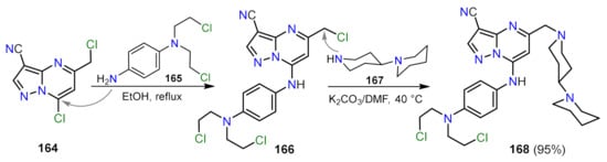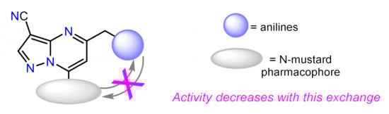 - Zhao, M.; Ren, H.; Chang, J.; Zhang, D.; Yang, Y.; He, Y.; Qi, C.; Zhang, H. Design and synthesis of novel pyrazolo[1,5-a]pyrimidine derivatives bearing nitrogen mustard moiety and evaluation of their antitumor activity in vitro and in vivo. Eur. J. Med. Chem. 2016, 119, 183–196. [Google Scholar] [CrossRef] [PubMed]