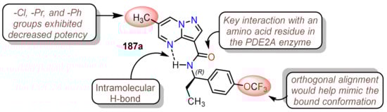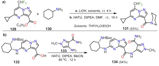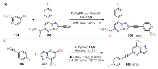 Similarly, the employment of β-diketones demonstrated to be effective for integrating fluorinated substituents at position 5, improving the electrophilic character of the 1,3-biselectrophile. Petricci and co-workers achieve the synthesis of 6, where the carbonyl group substituent controls the reaction regioselectivity (Scheme 2a) [31]. Likewise, Lindsley and co-workers presented a protocol to obtain the 7-trifluoromethyl derivative 9 wherein the employment of heating by microwave (MW) irradiation significantly reduces the required reaction time. However, the brominated aminopyrazole 7a is more reactive than 4 due to the electronic nature of the respective substituents (Scheme 2b) [32].