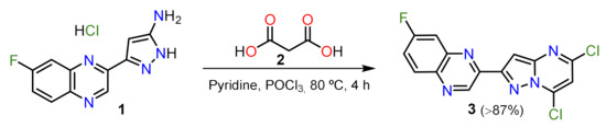 In this context, Yamagami and co-workers developed a method to produce the 5,7-dichloro-2-hetarylpyrazolo[1,5-a]pyrimidine 3 via the cyclocondensation reaction of the 5-amino-3-hetarylpyrazole 1 with malonic acid (2) (Scheme 1) [30]. In this approach, the addition of POCl3 in the presence of a catalytic amount of pyridine produces an activated species of malonic acid phosphoric ester. This discovery led to the synthesis of 3 in a higher yield in a reduced time compared to the alternative conditions of dimethyl malonate under basic media as show by the authors. Moreover, this strategy eliminates the need for additional reactions that convert a hydroxyl group to chloride.