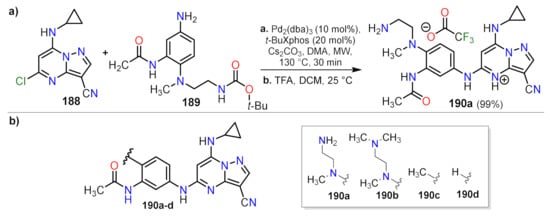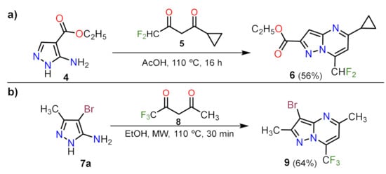 Synthesis examples of fluorinated pyrazolo[1,5-a]pyrimidines (a) 6 and (b) 9.