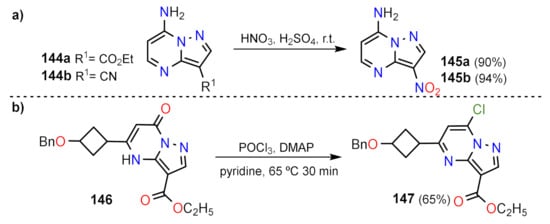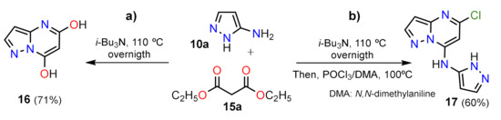 Furthermore, Fu and co-workers reported in 2020 a method to control the regioselectivity of the reaction. The reaction took place as expected with an excess of diethyl malonate (15a), and the pyrazolo[1,5-a]pyrimidine 16 is obtained in a 71% yield [36] (Scheme 4). However, adding 15 in stoichiometric quantity and heating the mixture neat produces the exocyclic amine from 10a as the only available nucleophile. Hence, applying Vilsmeier-Haack (POCl3/N,N-dimethylaniline) conditions facilitates the annulation and subsequent hydroxyl/chloride exchange for delivering derivative 17.