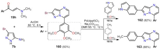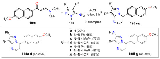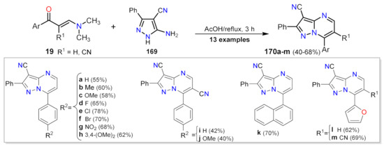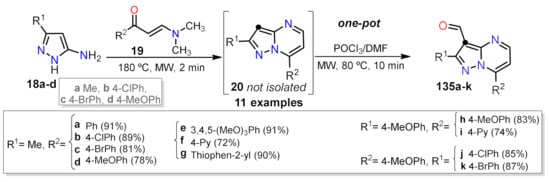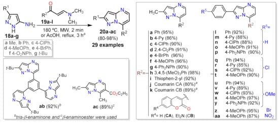 Conversely, if the 1,3-biselectrophilic system is a β-enaminone moiety, it enhances the reactivity or performance compared to 1,3-dicarbonyl compounds [1,37,38]. Portilla and co-workers employed diverse β-enaminone derivatives 19a–l following a highly efficient methodology under MW irradiation, obtaining various 2,7-disubstituted products 20a–ac in high yields (Scheme 5) [17,18,21,38]. The regioselectivity of the reaction can be controlled using the dimethylamino leaving group, where the initial condensation proceeds via an addition–elimination mechanism (aza-Michael type), thus bonding the NH2-group of the starting aminopyrazole with the Cβ of 19a–l [37]. Successively, the cyclocondensation occurs by a nucleophilic attack of the pyrazolic nitrogen to the residual carbonyl group, where the subsequent loss of a water molecule leads to products 20a–ac [1,37,38].