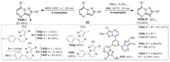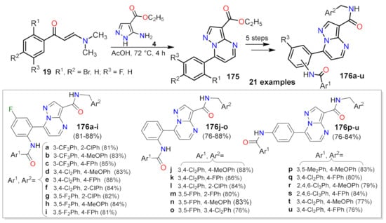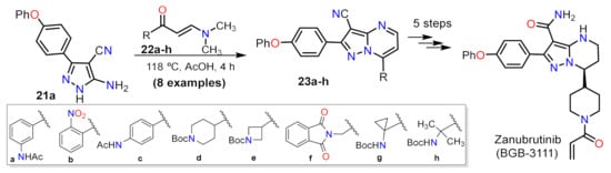 Following a similar approach, Guo and co-workers in 2019 reported the interesting structure series 23a–h bearing various types of nitrogenous groups at position 7, which were obtained by using β-enaminone derivatives 22a–h. Notably, the authors achieved via compound 23d the discovery and preclinical characterization of Zanubrutinib (BGB-3111): a novel, potent, and selective covalent inhibitor of Bruton’s tyrosine kinase. However, the obtained yields for intermediates 23a–h were not found (Scheme 6) [39]. In other studies, the N-heterocyclic core has been synthetized from β-enaminone derivatives bearing aryl groups substituted with halogen atoms or methoxy groups. Additionally, carboxamides, aryl groups, nitriles, and esters have been employed as substituents on the starting NH-3-aminopyrazole [40,41,42].