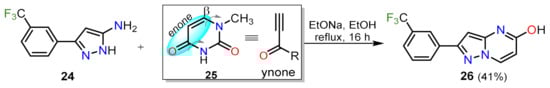 Xu and co-workers reported an interesting method where 1-methyluracil (25), a heterocyclic β-enaminone, reacts with the aminopyrazole 24. Through the uracil ring-opening induced by 24 and a later loss of a methylurea molecule, the 2-aryl-5-hydroxypyrazolo[1,5-a]pyrimidine 26 is produced. Employing an excess of 24, it is possible to avoid the chromatographic separation for the purification of 26 (Scheme 7) [43]. Curiously, β-enaminones or, in general, the enone systems bearing a leaving group at β-position (e.g., Cl, OR, NR2, etc.) are synthetic analogous of 1,3-biselectrophilic ynones.