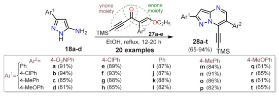 In a similar approach, Pankova and co-workers incorporated an alkyne group at position 7 of the fused ring (compounds 28a–t) by using the enone 27 having an ethoxy group at β-position [14]. Reaction yields are increased with electron withdrawer groups (EWGs) attached to the 4-aryl moiety in 27, evidencing an electronic dependence on the nature of substituents. Likewise, the cyclization regiospecificity (enone vs. ynone moiety) emerges from the trimethylsilyl (TMS) group high electron-donating effect in π-electron systems (Scheme 8). This synthetic approach results in an attractive way to obtain the 7-alkynyl-2,6-diarylpyrazolo[1,5-a]pyrimidines 28a–t, which later could undergo Pd-catalyzed carbon–carbon (C–C) cross-coupling reactions.