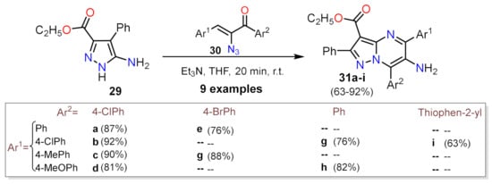 Moreover, the employment of enones for PP derivatives synthesis with two aryl substituents has been a matter of interest with different approaches. Adib and co-workers described using azidochalcones 30, which yield milder conditions for synthesizing polysubstituted, products 31 in moderate to excellent yields (Scheme 9) [44]. The authors report short times for reactions and also established a recrystallization purification process. For these reactions, catalysis has been carrying out using ionic liquids [13] and nanoparticles [45], resulting in improved yields when the substituents were in the aryl group.