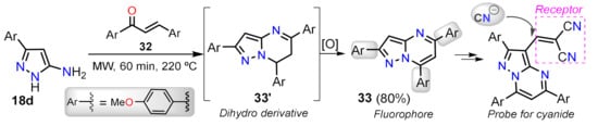 In the previous examples, enones bearing a leaving group at β-position were used as a 1,3-biselectrophile system. However, the reaction is often tricky when simple enones like chalcone derivatives are used, due to the unsaturation required in products [19,46]. Despite the inconvenience, this methodology provides valuable results for introducing aryl groups at positions 5 and 7 of the aza-heterocyclic core, with the advantage that starting materials are commercial or readily available by simple reactions (e.g., Claisen–Schmidt condensations). In this respect, Portilla and co-workers carried out the synthesis under rigorous (high temperature for a relatively long time) MW conditions of 2,5,7-tris(4-methoxyphenyl)pyrazolo[1,5-a]pyrimidine (33) starting from the substituted chalcone 32 and aminopyrazole 18d. This synthesis allowed us to design and implement a probe for cyanide (CN−) sensing by a nucleophilic addition reaction on the carbon–carbon double bond of the receptor group and an intramolecular charge transfer (ICT) photophysical phenomenon (Scheme 10) [19].