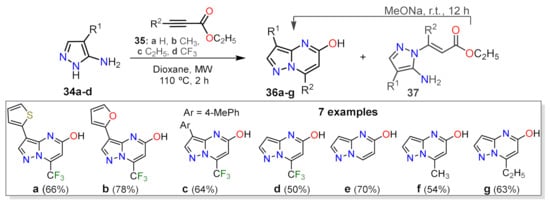 Jismy and co-workers developed protocols for PP derivatives synthesis based on 1,3-biselectrophilic ynones [47,48,49]. Unlike previous approximations, employing ynones delivers to hydroxy/enone substituents at position 5 of the fused pyrazole. Thus, it is possible to obtain an addition acyclic intermediate 37 that, under basic media, delivers derivatives 36 (Scheme 11) [48]. The authors evaluate different conditions such as solvent, temperature, time, Lewis acid catalysis, and MW heating. This synthetic strategy produces compounds substituted at position 7 with inherently electrophilic groups such as CF3 (36a–d), which could be added in this manner, avoiding complex post-functionalization steps [49].