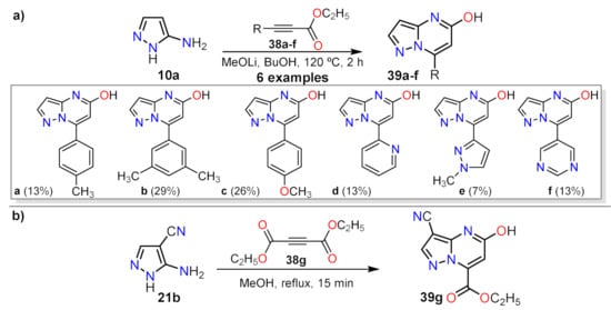 Synthesis of 5-hydroxypyrazolo[1,5-a]pyrimidines (a) 39a–f (poor yields, an opportunity for research) and (b) 39g.