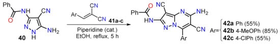 Synthesis of pyrazolo[1,5-a]pyrimidines 42a–c using arylidenemalononitriles 41a–c.