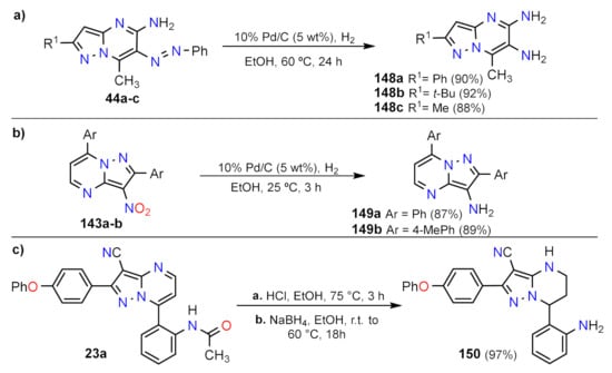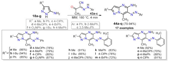 Similarly, Portilla and co-workers developed an MW-assisted methodology to obtain 6-(aryldiazenyl)pyrazolo[1,5-a]pyrimidines 44a–q by using 1,3-biselectrophilic derivatives bearing a hydrazone functional group at position 2, that is, reagent 43a–c (Scheme 14) [53]. Remarkably, the synthesis depicted in Scheme 14 made it possible to introduce an amino group at position 5 of the heterocyclic core via a reductive azo bond cleavage [53]. Additionally, the electronic properties of the starting aminopyrazole 18 from various substituents at position 5 were evaluated. Notably, in this methodology, the authors report no solvent for the reaction, and purification requires little to no effort.