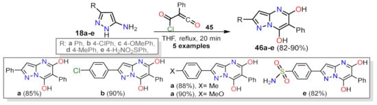 Furthermore, Zahedifar and co-workers reported the use of freshly prepared ketenes 45 in the preparation of compounds 46 from the corresponding substituted aminopyrazole 18a–e under reflux in tetrahydrofuran (THF). The authors report high yields for the synthetized pyrazolo[1,5-a]pyrimidines 46a–e and relatively short reaction times while that purification was carrying out through recrystallization (Scheme 15) [54].