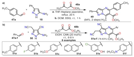 Importantly, the pyrazolo[1,5-a]pyrimidines synthesis by multicomponent reactions have also been reported. In this context, the most common approximation resembles a Mannich reaction whose products usually undergo a later oxidation reaction. It is desirable to block any position which could lead to a side reaction, given that the derivatives obtained result highly substituted. Li et al. reported an approach using large quantities of the starting materials 47a and 18 obtaining a dihydro derivative (not shown). Subsequently, the authors achieved an oxidation with DDQ without an intermediate purification step involved, to produce the unsaturated product 49 in 64% yield (Scheme 16a) [55].