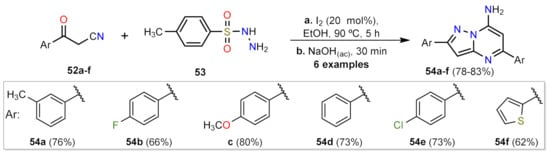 On the other hand, Jiang and co-workers reported an iodine-catalyzed pseudo-multicomponent reaction starting from aroylacetonitriles (β-ketonitriles) 52 and the sulphonyl hydrazine 53 [58]. The authors achieved derivatives 54, and by involving two molecules of 52, the positions 2 and 5 become substituted with the same aryl group. The reactions present moderate to good yields in a process that readily gives salts (Scheme 17). Notably, these compounds could have a longer shelf life compared with their analogs 54a–f.