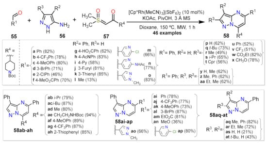 Likewise, Ellman et al. [59] designed a method based on catalysis with Rh complexes to obtain the pyrazolo[1,5-a]pyrimidines 58a–at through the multicomponent reaction of aldehydes 55, aminopyrazoles 56, and sulfoxonium ylides 57 (Scheme 18). The synthesis of 58 was suitable for aldehydes with electron-donating groups (EDGs), heteroaryl, and haloaryl; however, enolizable aldehydes proved difficult substrates. The authors evaluated diversely substituted sulfoxonium ylides, obtaining good to excellent yields for 58ab–ah. The reaction yield presents an increased susceptibility to pyrazole modification compared to the aldehydes and sulfoxonium ylides. Notably, the conditions optimized for the reaction gave a setup with benchtop materials, shorts reaction times, and high modulation options. Even though it is intended to be an MW heating protocol, conventional heating was also evaluated, providing good results. The scale-up of the reaction to 1 mmol yield 77% of the expected product using a lower catalyst charge (5 mol%).