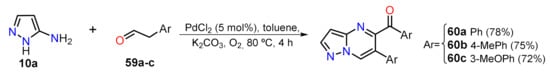 Tiwari and co-workers prepared fused heterocycles 60a–c through a C–C bond formation catalyzed with palladium [60]. The reaction proved efficient in generating the cyclic pyrimidine ring. However, only aryls without halogen or other exchangeable groups should be used by similar approximations reducing the scope of producing side products (Scheme 19).