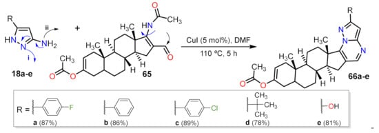 Boruah and Nongthombam focused on developing fluorescent probes with biological activity by the androstenol derivatives 66 synthesis, which uses copper (I) iodide as a catalyst [62]. The synthesis proved to be efficient with yields ranging from 78 to 89%, where the pyrazolic nitrogen of 18 attacks the 1,3-biselectrophile 65 probably by a Michael type conjugated addition and the acetamide group as a leaving group (i). Subsequently, the cyclocondensation between the formyl (CHO) and amino (NH2) groups (ii) of the respective cyclization intermediate leads to the formation of 66a–e (Scheme 21).