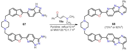 Comparatively, Mekky and co-workers carried out the synthesis of a bisbenzofuran derivative bearing two pyridopyrazolo[1,5-a]pyrimidine moieties (compound 68). In addition to β-enaminone 19a, the authors included β-dicarbonyl compounds or arylidenemalononitriles as 1,3-biselectrophilic systems, which were cyclocondensed with the fused NH-aminopyrazole 67. The authors also evaluated the repercussion of MW heating achieving better yields and shorter reaction times (Scheme 22) [63].