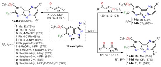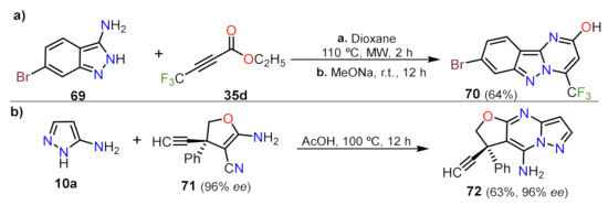 Likewise, Jismy and co-workers evaluated a synthesis starting from the indazoles 69 and the appropriate alkyne 35d to obtain the benzo-condensed derivative 70, which possesses a CF3 and hydroxyl group on the pyrimidinic moiety (Scheme 23a) [64]. The authors also evaluated other positions for the bromo substituent in the amino-indazole, obtaining similar yields to that of 70 [64]. Similarly, Song et al. evaluated the obtention of the furan-fused product 72, which is achieved by a Michael type conjugated addition over the enaminonitrile 71, conserving the enantiomeric excess from the initial substrate (Scheme 23b) [65].