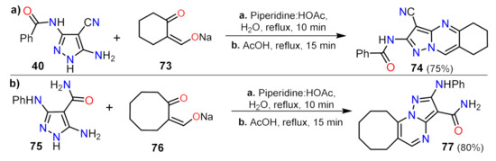 Ultimately, fused cycloalkanes to the PP core can be obtained, In this context, Elgemeie et al. developed various successful examples [27,66] by using trapped enolates (enone type compounds, 73 or 76), which by a cyclocondensation reaction with NH-aminoprazoles (40 or 75), produces the tricyclic derivatives 74 or 77 (Scheme 24). The cycloalkanes to be fused vary from cyclopentane to cyclooctane, though these compounds are not functionalized in the provided examples. Additionally, the electronic effects on the starting pyrazole drive the reaction, showing, for example, better yields from 75 than those obtained from 40 against the same enone.