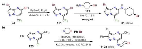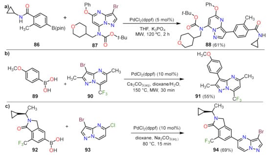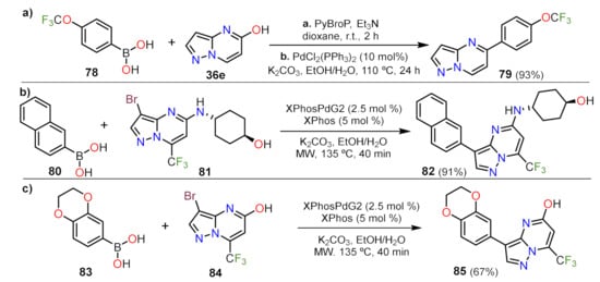Jismy and co-workers designed a method for functionalizing 36e at position 5 using a one-pot synthesis. They produce an exchange of hydroxyl group for a chloride atom by a NAS reaction; thus, employing optimized conditions for the coupling reactions could achieve aryls at position 5 like in product 79 (Scheme 25a) [48]. The reaction was further applied in the amine 3-bromosubstituted 81 and was optimized, finding the highly reproducible conditions to obtain 82 (Scheme 25b) [47]. The reaction shows an improvement in reaction times, and also, regarding the previous work, the authors found that modifying the ligand and catalyst enables the functionalization of the nucleophilic site at the pyrazolic moiety. Recently, they provided a method to add an aryl moiety at position 3 of the fused pyrazole 84, which has a hydroxyl/enone group at position 5 and a CF3 group at position 7 (product 85, Scheme 25c) [64]. The reaction conditions were screened to find an optimal setup, though the reaction conditions with the better performance are those previously reported. Interestingly, the fluorophenyl group and some heterocycles were found to be compatible with this strategy, with yields from 67 to 84% [64].