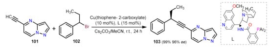 - Dong, X.Y.; Zhang, Y.F.; Ma, C.L.; Gu, Q.S.; Wang, F.L.; Li, Z.L.; Jiang, S.P.; Liu, X.Y. A general asymmetric copper-catalysed Sonogashira C(sp 3)–C(sp) coupling. Nat. Chem. 2019, 11, 1158–1166. [Google Scholar] [CrossRef]
